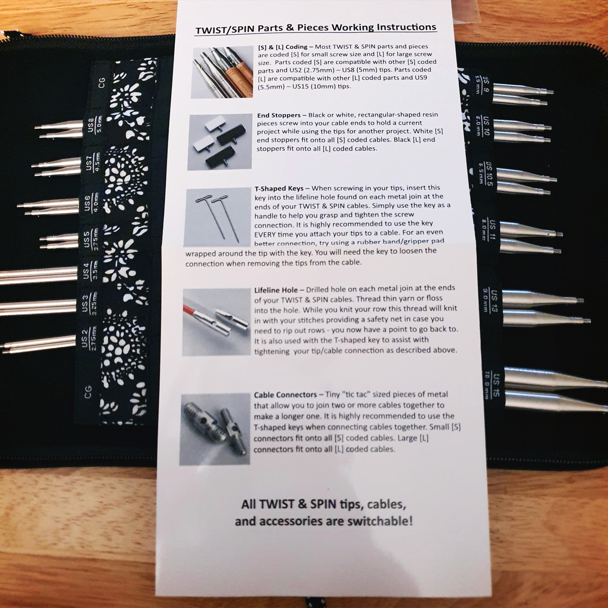 - 바늘에는 US 사이즈 정보와 미터법(mm) 사이즈, 그리고 케이블 연결 부위 사이즈(S/L)가 적혀 있다.